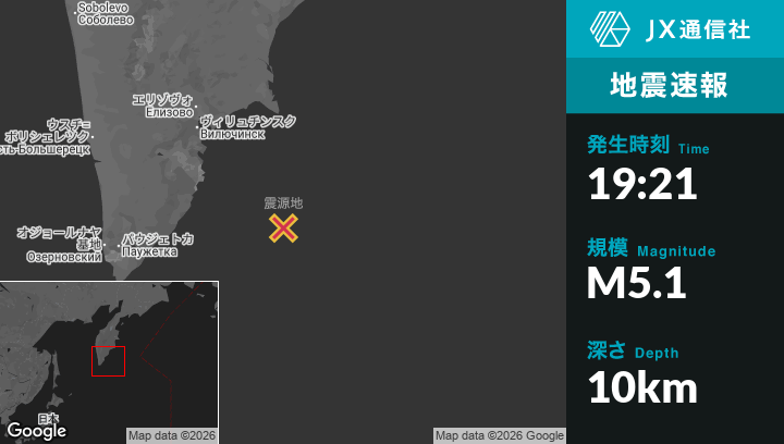 1月26日 19:21頃、ロシアのVilyuchinskから南東175kmの地点でM5.1の地震がありました。
