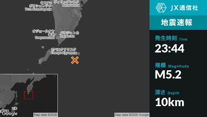 1月26日 23:44頃、ロシアのSevero-Kuril’skから東南東139kmの地点でM5.2の地震がありました。
