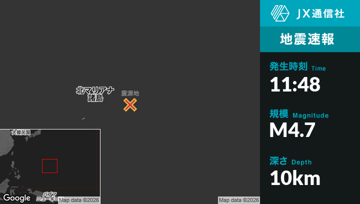 2月24日 11:48頃、北マリアナ諸島のSaipanから東南東167kmの地点でM4.7の地震がありました。