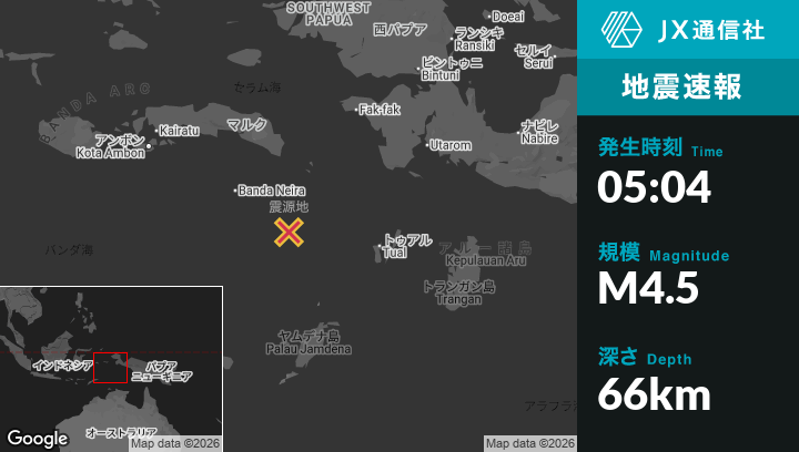 2月26日 05:04頃、インドネシアのTualから西北西203kmの地点でM4.5の地震がありました。