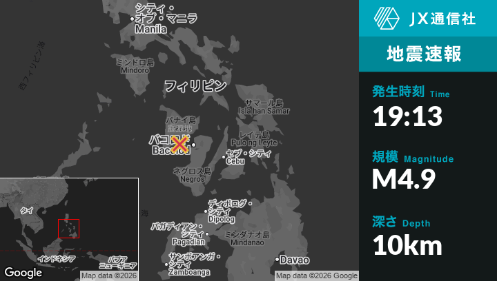 3月02日 19:13頃、フィリピンのCadagmayan Norteから南東0kmの地点でM4.9の地震がありました。