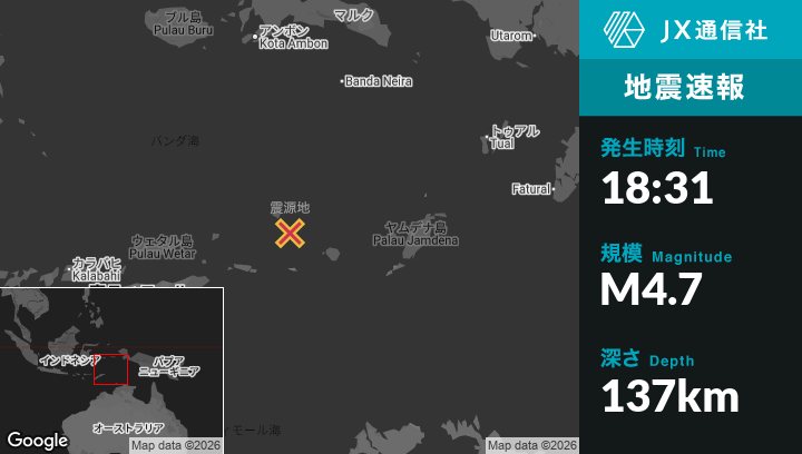 3月04日 18:31頃、東ティモールのLospalosから東北東241kmの地点でM4.7の地震がありました。