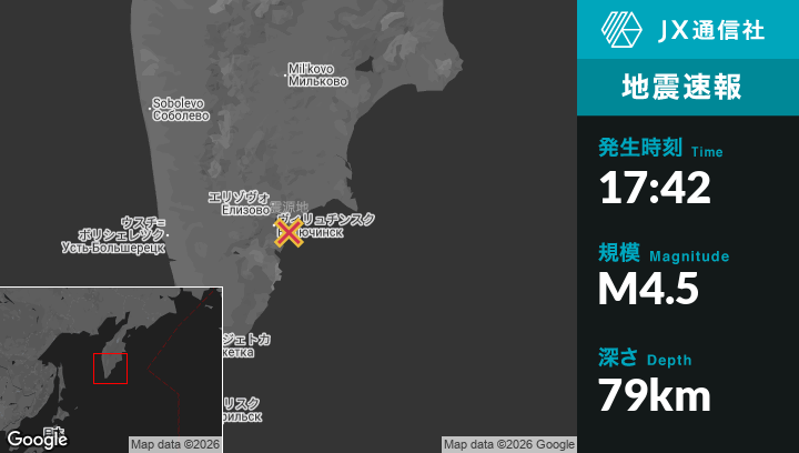 3月07日 17:42頃、ロシアのPetropavlovsk-Kamchatskyから南南東16kmの地点でM4.5の地震がありました。