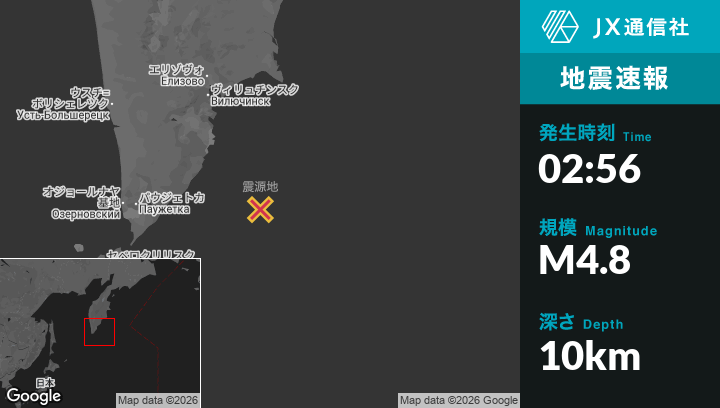 3月09日 02:56頃、ロシアのVilyuchinskから南南東181kmの地点でM4.8の地震がありました。