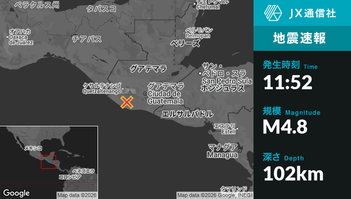 3月09日 11:52頃、グアテマラのRío Bravoから南西2kmの地点でM4.8の地震がありました。