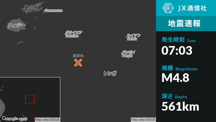 | 震源地 | トンガのHoumaから西北西249kmの地点 |