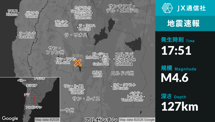 | 震源地 | アルゼンチンのCandelariaから西北西113kmの地点 |