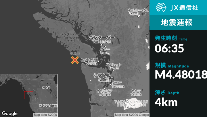 | 震源地 | カナダのUclueletから南東47kmの地点 |