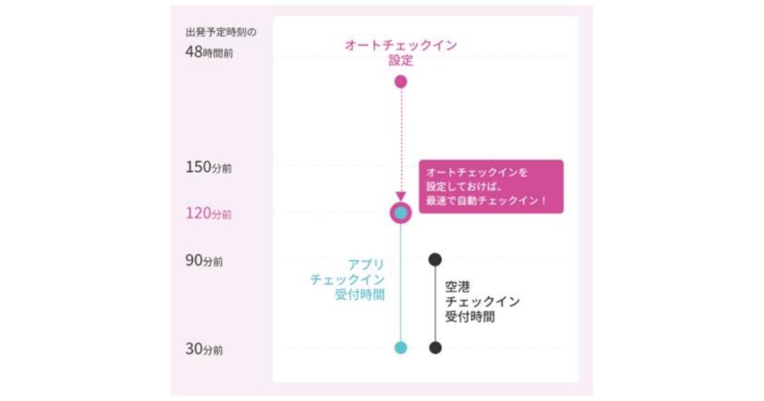 オートチェックイン機能は、出発48時間前から150分前までの間に、Peach公式アプリ上で事前設定することで、出発予定時刻の120分前に自動でチェックインが完了するもの。