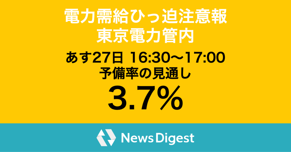 経済産業省は26日、あす(27日)の東京電力管内の電力需給が厳しくなる見込みだとして、電力需給ひっ迫注意報を発令すると発表した。