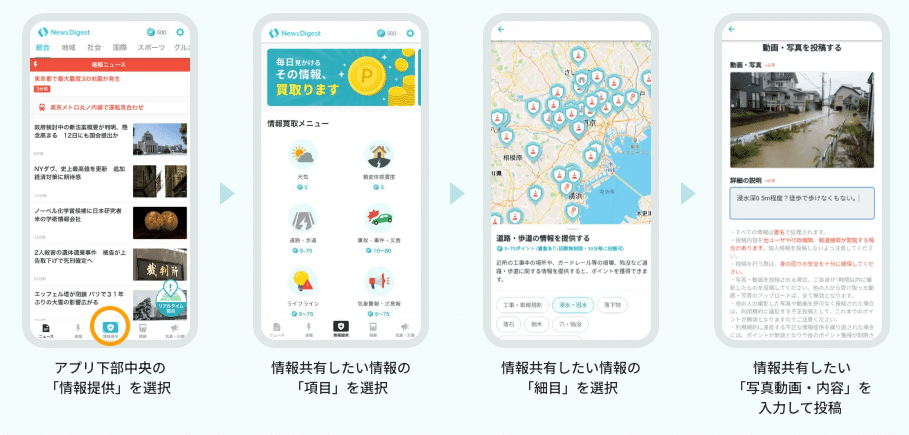 また、NewsDigestから投稿いただいた情報が、リアルタイム防災マップに掲載されます。投稿で買い物に使えるポイントをお配りしていますので、ぜひ、身の回りの情報を投稿してください。