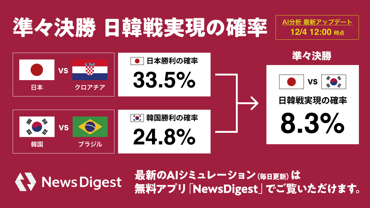 分析の結果、日本がクロアチアに勝利する確率は33.5%、韓国がブラジルに勝利する確率は24.8%となっており、いずれも数字上は厳しい情勢だ。日韓対決が実現する確率は8.3%にとどまっている。