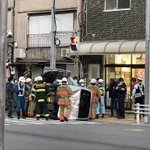 4〜5台の玉突き事故してる💦 軽ワンボックス マイクロバス ベンツフロントが大破💥 軽ワンボックスが横転💦 ベンツが突っ込んだのかな?💧 https://t.co/AOfJLd03G6