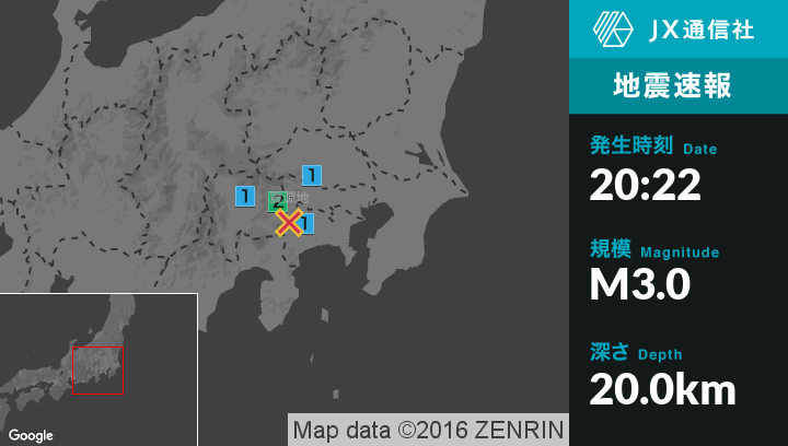 | 震度1 | 山梨県中・西部, 東京都多摩西部, 神奈川県西部 |