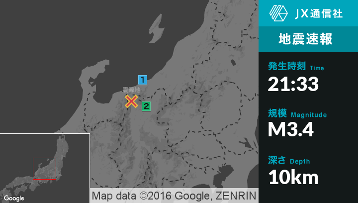| 震度1 | 長野市, 大町市, 白馬村, 小川村, 糸魚川市, 妙高市, 上越市 |