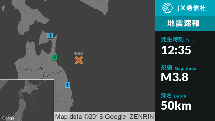 | 震度1 | 十和田市, 野辺地町, 東北町, おいらせ町, 青森南部町, 東通村, 久慈市, 岩手洋野町, 八幡平市, 軽米町 |
