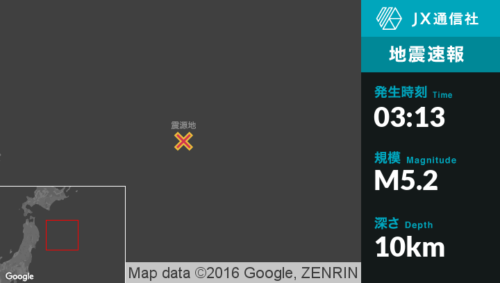 | 震度2 | 函館市, 根室市, 八戸市, 七戸町, おいらせ町, 三戸町, 五戸町, 青森南部町, 階上町, 東通村, 宮古市, 釜石市, 盛岡市, 二戸市, 八幡平市, 葛巻町, 岩手町, 矢巾町, 石巻市 |