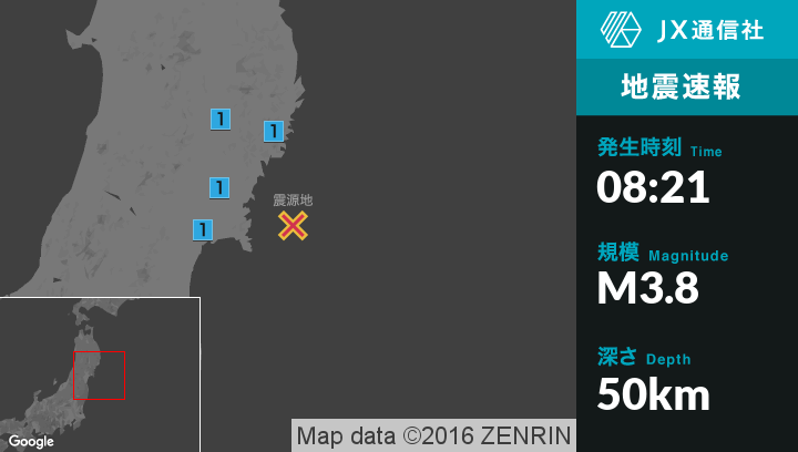 | 震度1 | 大船渡市, 一関市, 南三陸町, 石巻市, 東松島市, 女川町 |