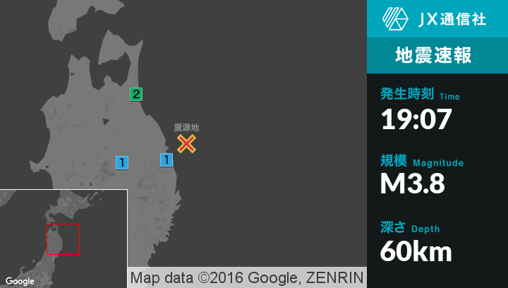 | 震度1 | 八戸市, 十和田市, 三戸町, 五戸町, 青森南部町, 久慈市, 田野畑村, 岩手洋野町, 盛岡市, 軽米町, 九戸村 |