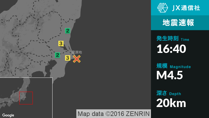 | 震度1 | 下妻市, 常総市, 取手市, 牛久市, つくば市, 坂東市, 桜川市, つくばみらい市, 阿見町, 境町, 利根町, 水戸市, 日立市, 笠間市, ひたちなか市, 茂原市, 千葉中央区, 千葉花見川区, 千葉稲毛区, 千葉緑区, 千葉美浜区, 船橋市, 松戸市, 野田市, 千葉佐倉市, 柏市, 八千代市, 我孫子市, 鎌ケ谷市, 浦安市, 四街道市, 印西市, 白井市, 酒々井町, 栄町, 木更津市, 君津市, 富津市, 大多喜町, 御宿町, 宇都宮市, 小山市, 真岡市, 下野市, 芳賀町, 加須市, 鴻巣市, 久喜市, さいたま南区, さいたま緑区, 春日部市, 草加市, 戸田市, 八潮市, 三郷市, 幸手市, 吉川市, 白岡市, 宮代町, 杉戸町, 東京千代田区, 東京北区, 東京荒川区, 東京足立区, 東京江戸川区, 調布市, 町田市, 横浜鶴見区, 川崎川崎区 |