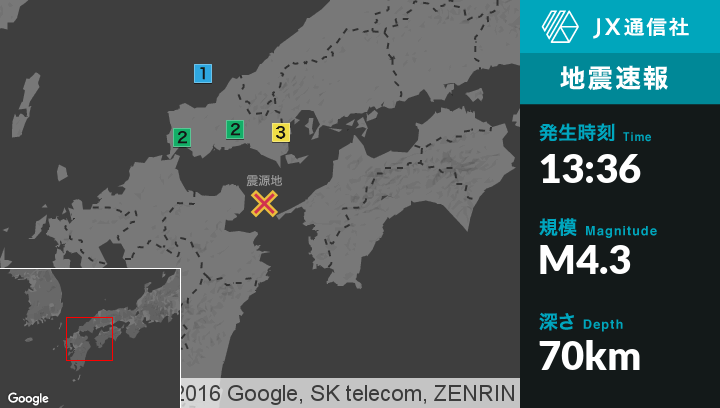 震度2岩国市, 柳井市, 和木町, 上関町, 平生町, 宇部市, 山口市, 防府市, 下松市, 安芸高田市, 三原市, 広島安芸区, 呉市, 大竹市, 東広島市, 廿日市市, 江田島市, 府中町, 大崎上島町, 今治市, 上島町, 松山市, 宇和島市, 八幡浜市, 大洲市, 西予市, 内子町, 伊方町, 愛南町, 宿毛市, 行橋市, 熊本高森町, 豊後高田市, 国東市, 姫島村, 大分市, 臼杵市