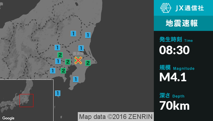 | 震度1 | さいたま浦和区, さいたま南区, さいたま緑区, 春日部市, 狭山市, 草加市, 蕨市, 戸田市, 八潮市, 三郷市, 幸手市, 吉川市, 白岡市, 埼玉三芳町, 杉戸町, 久喜市, 茂原市, 東金市, 香取市, 山武市, 大網白里市, 多古町, 九十九里町, 芝山町, 一宮町, 長柄町, 千葉稲毛区, 千葉若葉区, 千葉美浜区, 市川市, 松戸市, 野田市, 習志野市, 柏市, 市原市, 流山市, 我孫子市, 浦安市, 四街道市, 八街市, 印西市, 富里市, 酒々井町, 栄町, 館山市, 木更津市, 君津市, 富津市, 袖ケ浦市, 南房総市, 東京千代田区, 東京港区, 東京新宿区, 東京文京区, 東京品川区, 東京目黒区, 東京渋谷区, 東京中野区, 東京杉並区, 東京豊島区, 東京北区, 東京練馬区, 東京足立区, 八王子市, 武蔵野市, 三鷹市, 調布市, 町田市, 小金井市, 小平市, 国分寺市, 西東京市, 伊豆大島町, 横浜西区, 横浜中区, 横浜保土ケ谷区, 横浜磯子区, 横浜金沢区, 横浜戸塚区, 横浜港南区, 横浜旭区, 横浜緑区, 横浜瀬谷区, 横浜泉区, 横浜青葉区, 川崎中原区, 川崎高津区, 横須賀市, 藤沢市, 茅ヶ崎市, 大和市, 相模原中央区, 水戸市, 笠間市, 小美玉市, 土浦市, 石岡市, 龍ケ崎市, 常総市, 取手市, 牛久市, つくば市, 茨城鹿嶋市, 潮来市, 守谷市, 筑西市, 坂東市, 稲敷市, かすみがうら市, 桜川市, 行方市, 鉾田市, つくばみらい市, 美浦村, 阿見町, 利根町, 宇都宮市, 真岡市, 芳賀町, 伊豆市, 東伊豆町 |