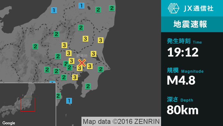 | 震度2 | 水戸市, 日立市, 常陸太田市, ひたちなか市, 常陸大宮市, 那珂市, 茨城町, 東海村, 大子町, 茨城古河市, 結城市, 龍ケ崎市, 下妻市, 常総市, 牛久市, つくば市, 茨城鹿嶋市, 潮来市, 守谷市, 筑西市, 稲敷市, 桜川市, 行方市, 鉾田市, つくばみらい市, 美浦村, 阿見町, 河内町, 八千代町, 五霞町, 境町, 利根町, 足利市, 栃木市, 佐野市, 鹿沼市, 小山市, 真岡市, 栃木さくら市, 那須烏山市, 上三川町, 益子町, 茂木町, 市貝町, 芳賀町, 壬生町, 野木町, 高根沢町, 栃木那珂川町, 日光市, 大田原市, 前橋市, 高崎市, 桐生市, 伊勢崎市, 太田市, 館林市, みどり市, 板倉町, 千代田町, 沼田市, 片品村, 熊谷市, 行田市, 東松山市, 羽生市, 深谷市, 滑川町, 嵐山町, 小川町, 吉見町, ときがわ町, 寄居町, さいたま西区, さいたま北区, さいたま大宮区, さいたま見沼区, さいたま中央区, さいたま桜区, さいたま浦和区, さいたま南区, さいたま岩槻区, 川口市, 所沢市, 狭山市, 上尾市, 越谷市, 蕨市, 戸田市, 入間市, 朝霞市, 和光市, 新座市, 桶川市, 北本市, 八潮市, 富士見市, 三郷市, 吉川市, 白岡市, 伊奈町, 埼玉三芳町, 毛呂山町, 越生町, 川島町, 宮代町, 杉戸町, 松伏町, 長瀞町, 千葉中央区, 千葉花見川区, 千葉稲毛区, 千葉若葉区, 千葉緑区, 千葉美浜区, 市川市, 船橋市, 成田市, 千葉佐倉市, 習志野市, 市原市, 流山市, 八千代市, 我孫子市, 鎌ケ谷市, 浦安市, 四街道市, 印西市, 白井市, 栄町, 東金市, 旭市, 香取市, 山武市, 長南町, 木更津市, 鴨川市, 君津市, 富津市, 南房総市, いすみ市, 東京中央区, 東京港区, 東京新宿区, 東京文京区, 東京台東区, 東京墨田区, 東京江東区, 東京品川区, 東京大田区, 東京世田谷区, 東京渋谷区, 東京中野区, 東京杉並区, 東京豊島区, 東京北区, 東京荒川区, 東京練馬区, 東京足立区, 東京葛飾区, 東京江戸川区, 八王子市, 武蔵野市, 三鷹市, 調布市, 町田市, 小平市, 日野市, 東村山市, 国分寺市, 狛江市, 東大和市, 清瀬市, 東久留米市, 多摩市, 稲城市, 西東京市, 青梅市, あきる野市, 横浜鶴見区, 横浜神奈川区, 横浜西区, 横浜南区, 横浜保土ケ谷区, 横浜磯子区, 横浜金沢区, 横浜港北区, 横浜戸塚区, 横浜港南区, 横浜旭区, 横浜緑区, 横浜瀬谷区, 横浜栄区, 横浜泉区, 横浜青葉区, 川崎川崎区, 川崎中原区, 川崎宮前区, 川崎麻生区, 横須賀市, 藤沢市, 三浦市, 大和市, 座間市, 相模原緑区, 相模原中央区, 相模原南区, 厚木市, 愛川町, 清川村, 白河市, 田村市, 棚倉町, 玉川村, 浪江町, 南アルプス市, 山梨北杜市, 甲州市, 身延町, 昭和町, 上野原市, 富士河口湖町, 長野南牧村, 東伊豆町 |