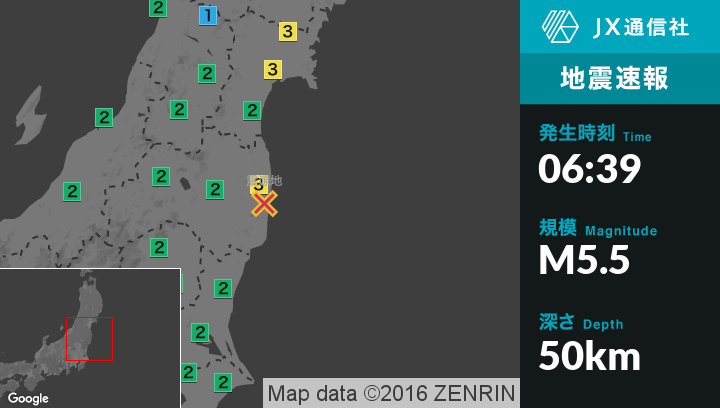| 震度2 | 登米市, 栗原市, 色麻町, 宮城加美町, 涌谷町, 宮城美里町, 仙台青葉区, 塩竈市, 東松島市, 松島町, 利府町, 大郷町, 大衡村, 白石市, 名取市, 角田市, 岩沼市, 蔵王町, 七ヶ宿町, 大河原町, 宮城川崎町, 丸森町, 亘理町, 相馬市, 川内村, 大熊町, 浪江町, 新地町, 飯舘村, 福島市, 郡山市, 白河市, 須賀川市, 二本松市, 田村市, 福島伊達市, 本宮市, 桑折町, 国見町, 川俣町, 大玉村, 鏡石町, 天栄村, 西郷村, 泉崎村, 中島村, 棚倉町, 矢祭町, 玉川村, 浅川町, 古殿町, 会津若松市, 喜多方市, 西会津町, 磐梯町, 猪苗代町, 会津坂下町, 湯川村, 柳津町, 会津美里町, 酒田市, 上山市, 村山市, 天童市, 東根市, 山辺町, 中山町, 河北町, 西川町, 米沢市, 南陽市, 高畠町, 山形川西町, 白鷹町, 日立市, 常陸太田市, 高萩市, 笠間市, 小美玉市, 茨城町, 東海村, 常総市, 潮来市, 稲敷市, 鉾田市, 大田原市, 高根沢町, 香取市, 印西市, 三条市, 加茂市, 見附市, 新発田市, 村上市 |