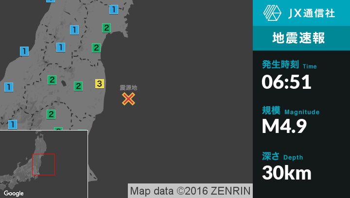 | 震度1 | 相馬市, 福島市, 福島伊達市, 桑折町, 大玉村, 矢吹町, 矢祭町, 平田村, 会津若松市, 下郷町, 西会津町, 会津坂下町, 柳津町, 会津美里町, 白石市, 名取市, 角田市, 蔵王町, 大河原町, 村田町, 柴田町, 宮城川崎町, 丸森町, 亘理町, 松島町, 大衡村, 女川町, 登米市, 大崎市, 色麻町, 宮城加美町, 宮城美里町, 水戸市, 常陸太田市, 北茨城市, ひたちなか市, 常陸大宮市, 那珂市, 小美玉市, 城里町, 東海村, 大子町, 土浦市, 石岡市, 取手市, 牛久市, つくば市, 筑西市, かすみがうら市, つくばみらい市, 日光市, 那須塩原市, 宇都宮市, 鹿沼市, 那須烏山市, 下野市, 益子町, 茂木町, 芳賀町, 高根沢町, 栃木那珂川町, 庄内町, 天童市, 米沢市, 南陽市, 高畠町, 白鷹町, 沼田市, 前橋市, 桐生市, 渋川市, 千代田町, 邑楽町, 加須市, 久喜市, 入間市, 宮代町, 香取市, 千葉美浜区, 野田市, 見附市, 新潟東区 |