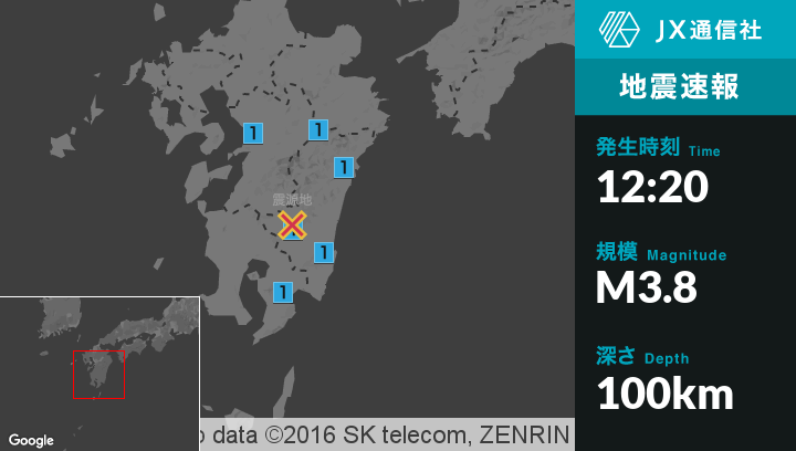 | 震度1 | 熊本美里町, 延岡市, 西都市, 宮崎美郷町, 高千穂町, 宮崎市, 国富町, 都城市, 小林市, 大崎町 |