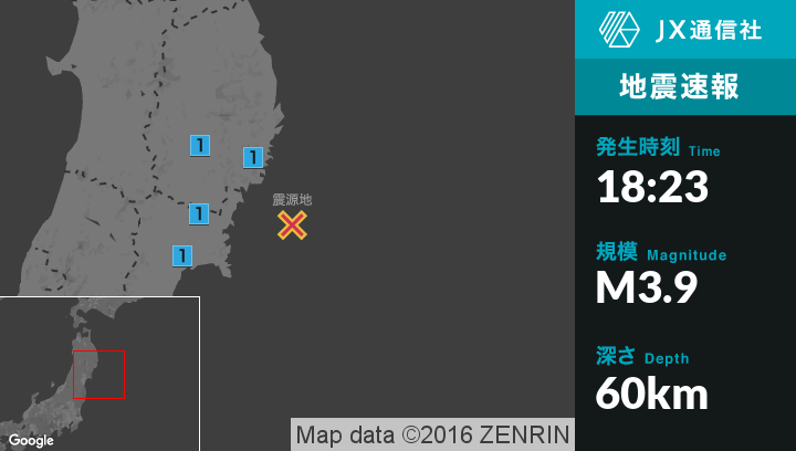 | 震度1 | 大船渡市, 花巻市, 一関市, 気仙沼市, 登米市, 石巻市 |
