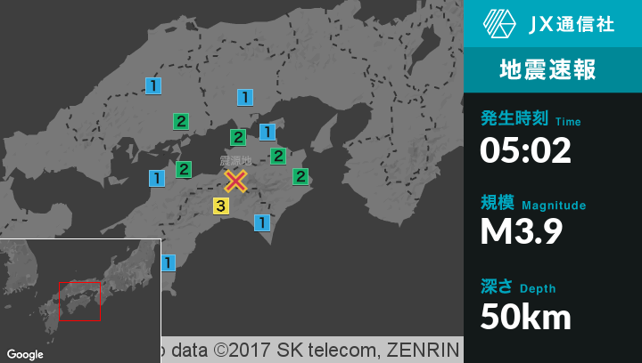 | 震度2 | 香美市, 本山町, 大豊町, 大川村, いの町, 福山市, 徳島三好市, 那賀町, 観音寺市, 三豊市, 綾川町, 琴平町, 多度津町, まんのう町, 新居浜市 |