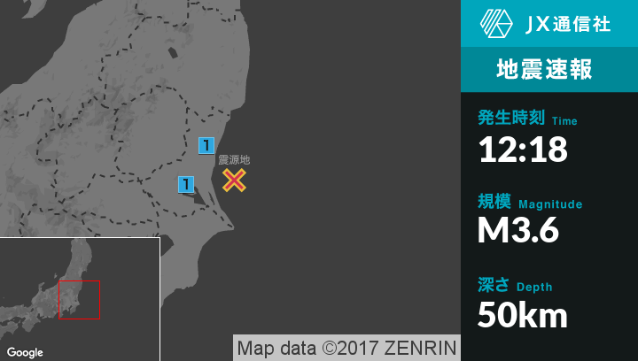 | 震度1 | 日立市, ひたちなか市, 城里町, 東海村, 茨城鹿嶋市, かすみがうら市 |