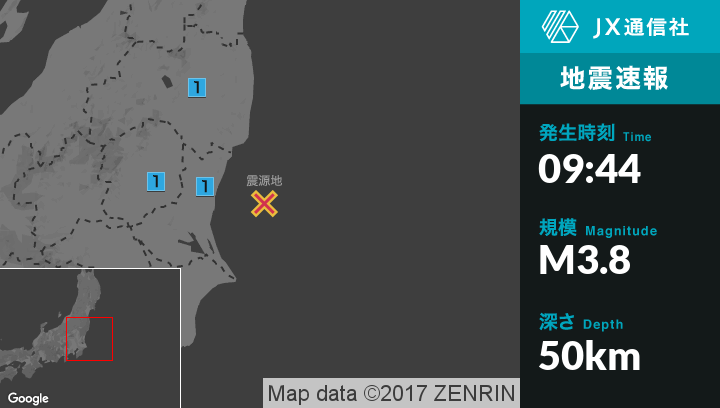 | 震度1 | 白河市, 水戸市, 日立市, ひたちなか市, 東海村, 益子町 |