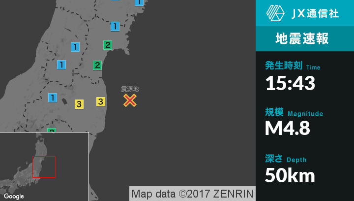 | 震度1 | 福島市, 郡山市, 二本松市, 福島伊達市, 桑折町, 川俣町, 大玉村, 西郷村, 矢吹町, 矢祭町, 塙町, 鮫川村, 石川町, 平田村, 古殿町, 三春町, 猪苗代町, 白石市, 名取市, 蔵王町, 大河原町, 村田町, 柴田町, 宮城川崎町, 仙台青葉区, 仙台宮城野区, 仙台若林区, 仙台太白区, 東松島市, 松島町, 七ヶ浜町, 利府町, 大衡村, 女川町, 気仙沼市, 登米市, 栗原市, 大崎市, 色麻町, 宮城加美町, 涌谷町, 宮城美里町, 南三陸町, 水戸市, ひたちなか市, 那珂市, 小美玉市, 茨城町, 土浦市, 石岡市, 取手市, 牛久市, つくば市, 茨城鹿嶋市, 潮来市, 筑西市, 坂東市, 稲敷市, かすみがうら市, 桜川市, 行方市, 鉾田市, 美浦村, 那須塩原市, 那須町, 宇都宮市, 真岡市, 那須烏山市, 下野市, 益子町, 茂木町, 市貝町, 芳賀町, 高根沢町, 栃木那珂川町, 大船渡市, 住田町, 盛岡市, 一関市, 中山町, 米沢市, 渋川市, 邑楽町, 加須市, 久喜市, 春日部市, 入間市, 宮代町, 香取市, 野田市, 成田市, 八千代市, 栄町, 東京千代田区 |