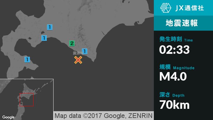 | 震度1 | 新冠町, 恵庭市, 函館市, 安平町, 浦河町, えりも町, 階上町, 東通村 |