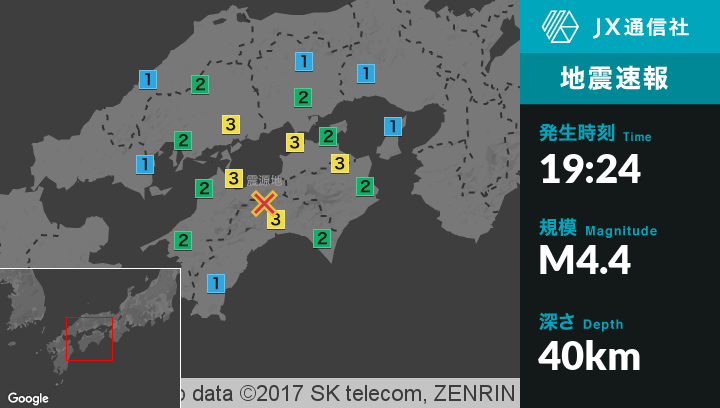 | 震度1 | 世羅町, 神石高原町, 広島三次市, 広島南区, 広島西区, 広島安佐南区, 広島安佐北区, 広島安芸区, 広島佐伯区, 江田島市, 海田町, 熊野町, 坂町, 徳島市, 鳴門市, 石井町, 藍住町, 阿南市, 勝浦町, 牟岐町, 美波町, 坂出市, 宇多津町, 琴平町, まんのう町, 土庄町, 三木町, 松山市, 東温市, 愛媛松前町, 宇和島市, 八幡浜市, 西予市, 内子町, 伊方町, 松野町, 愛南町, 須崎市, 室戸市, 東洋町, 奈半利町, 田野町, 北川村, 馬路村, 宿毛市, 四万十市, 中土佐町, 梼原町, 高知津野町, 四万十町, 黒潮町, 岡山北区, 岡山中区, 岡山東区, 笠岡市, 井原市, 備前市, 瀬戸内市, 赤磐市, 浅口市, 早島町, 里庄町, 矢掛町, 真庭市, 赤穂市, 南あわじ市, 浜田市, 川本町, 島根美郷町, 岩国市, 周防大島町 |
