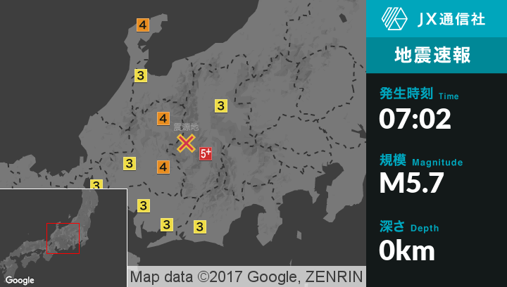 | 震度2 | 駒ヶ根市, 飯島町, 宮田村, 松川町, 阿南町, 平谷村, 根羽村, 天龍村, 喬木村, 豊丘村, 大鹿村, 上田市, 岡谷市, 東御市, 安曇野市, 長野南牧村, 立科町, 青木村, 長和町, 下諏訪町, 富士見町, 原村, 山形村, 筑北村, 長野市, 大町市, 小川村, 志賀町, 宝達志水町, 能登町, 金沢市, 小松市, 加賀市, かほく市, 白山市, 能美市, 津幡町, 白川村, 多治見市, 美濃加茂市, 土岐市, 可児市, 坂祝町, 富加町, 川辺町, 七宗町, 八百津町, 白川町, 東白川村, 御嵩町, 大垣市, 関市, 美濃市, 羽島市, 各務原市, 岐阜山県市, 本巣市, 郡上市, 海津市, 笠松町, 養老町, 関ケ原町, 神戸町, 輪之内町, 安八町, 揖斐川町, 大野町, 岐阜池田町, 北方町, 高岡市, 氷見市, 小矢部市, 南砺市, 富山市, 滑川市, 舟橋村, 上市町, 浜松中区, 浜松東区, 浜松西区, 浜松南区, 浜松北区, 浜松浜北区, 磐田市, 掛川市, 湖西市, 御前崎市, 菊川市, 静岡森町, 伊豆市, 伊豆の国市, 富士宮市, 富士市, 静岡葵区, 静岡駿河区, 島田市, 焼津市, 藤枝市, 牧之原市, 川根本町, 豊橋市, 豊川市, 蒲郡市, 田原市, 設楽町, 東栄町, 名古屋千種区, 名古屋東区, 名古屋中区, 名古屋昭和区, 名古屋中川区, 名古屋港区, 名古屋守山区, 名古屋緑区, 名古屋天白区, 岡崎市, 一宮市, 瀬戸市, 春日井市, 愛知津島市, 碧南市, 刈谷市, 豊田市, 安城市, 西尾市, 犬山市, 愛知江南市, 小牧市, 稲沢市, 東海市, 大府市, 知立市, 尾張旭市, 岩倉市, 豊明市, 日進市, 北名古屋市, 弥富市, 愛知みよし市, あま市, 長久手市, 東郷町, 豊山町, 大口町, 扶桑町, 大治町, 飛島村, 阿久比町, 東浦町, 愛知美浜町, 武豊町, 幸田町, 長浜市, 高島市, 愛荘町, 豊郷町, 甲良町, 多賀町, 大津市, 草津市, 守山市, 栗東市, 野洲市, 滋賀日野町, 久喜市, 横浜戸塚区, 福井市, 大野市, 越前市, 越前町, 敦賀市, 小浜市, 高浜町, 福井おおい町, 福井若狭町, 甲府市, 南アルプス市, 山梨北杜市, 甲斐市, 中央市, 市川三郷町, 身延町, 富士川町, 昭和町, 忍野村, 山中湖村, 富士河口湖町, 四日市市, 桑名市, 鈴鹿市, 亀山市, 東員町, 菰野町, 三重朝日町, 津市, 松阪市, 京丹後市, 与謝野町, 京都上京区, 京都中京区, 京都下京区, 宇治市, 亀岡市, 城陽市, 向日市, 長岡京市, 八幡市, 京田辺市, 南丹市, 大山崎町, 久御山町, 井手町, 宇治田原町, 精華町, 南山城村, 大阪西淀川区, 大阪東淀川区, 大阪淀川区, 大阪平野区, 豊中市, 高槻市, 寝屋川市, 大東市, 箕面市, 四條畷市, 島本町, 能勢町, 豊岡市, 尼崎市, 西宮市, 加古川市, 川西市, 三田市, 篠山市, 丹波市 |