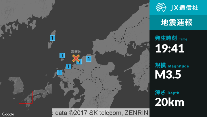 | 震度1 | 福岡博多区, 福岡中央区, 福岡西区, 福岡城南区, 宗像市, 福岡古賀市, 福津市, 糸島市, 福岡那珂川町, 須恵町, 新宮町, 久山町, 粕屋町, 宮若市, 唐津市, 平戸市, 松浦市, 長崎対馬市, 壱岐市 |
