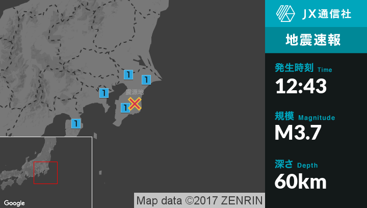 | 震度1 | 東金市, 大網白里市, 一宮町, 長南町, 千葉中央区, 千葉緑区, 市原市, 木更津市, 勝浦市, 君津市, いすみ市, 横浜磯子区, 横浜港南区, 三浦市, 東伊豆町 |