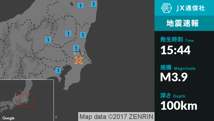 | 震度1 | 白河市, 田村市, 棚倉町, 玉川村, 浅川町, 浪江町, 水戸市, 日立市, 高萩市, 笠間市, ひたちなか市, 常陸大宮市, 小美玉市, 東海村, 土浦市, つくば市, 筑西市, 宇都宮市, 栃木市, 佐野市, 真岡市, 下野市, 渋川市, 横浜神奈川区 |