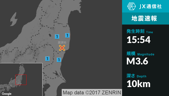 | 震度1 | 棚倉町, 矢祭町, 古殿町, 小野町, いわき市, 日立市, 宇都宮市 |