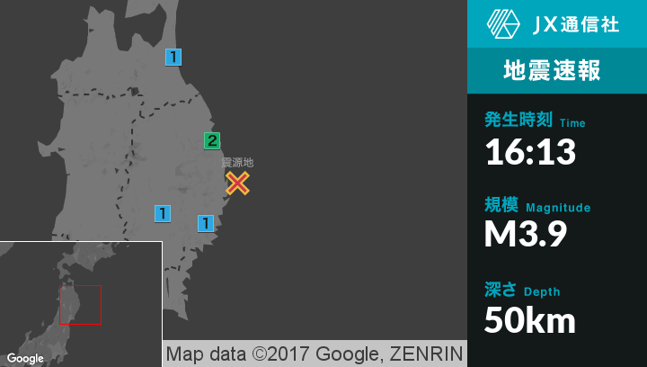| 震度1 | 田野畑村, 釜石市, 住田町, 花巻市, 遠野市, 一関市, 階上町 |