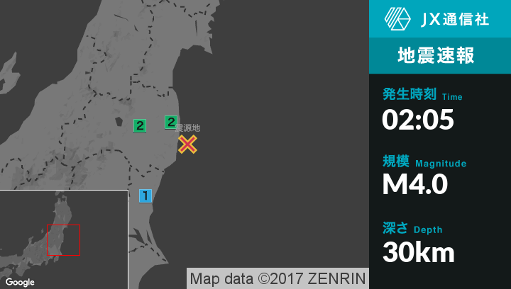 | 震度1 | 白河市, 玉川村, 小野町, 福島広野町, 楢葉町, 富岡町, 川内村, 大熊町, 双葉町, 浪江町, 日立市 |