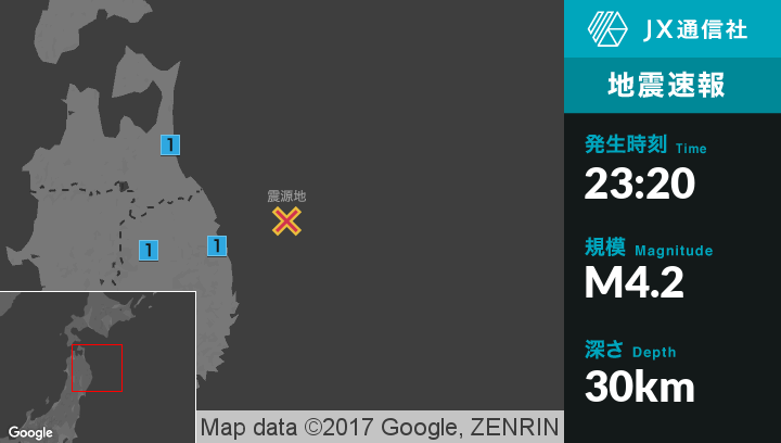 | 震度1 | 八戸市, 三沢市, 野辺地町, おいらせ町, 五戸町, 青森南部町, 階上町, 普代村, 盛岡市, 二戸市, 八幡平市, 軽米町 |