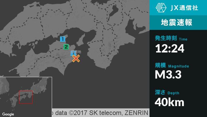 | 震度1 | 徳島市, 吉野川市, 阿波市, 神山町, 阿南市, 那賀町, 美波町, さぬき市, 土庄町, 小豆島町 |