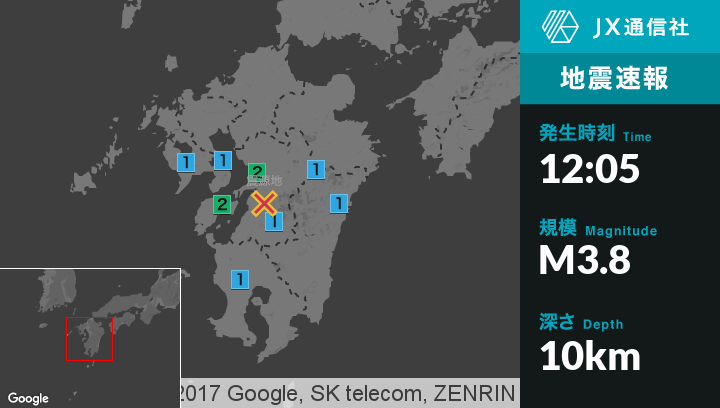 | 震度2 | 八代市, 宇城市, 熊本美里町, 上天草市 |