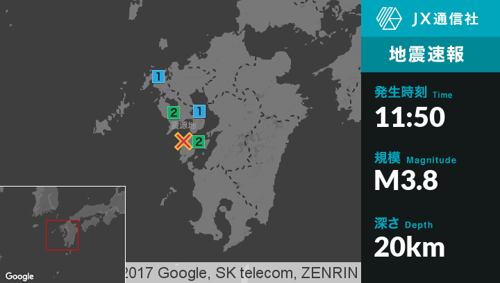 | 震度2 | 長崎市, 諫早市, 天草市, 苓北町 |