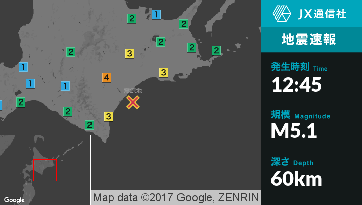 | 震度1 | 士幌町, 上士幌町, 厚岸町, 中富良野町, 訓子府町, 置戸町, 苫小牧市, 白老町, 厚真町, むかわ町, 羅臼町, 札幌北区, 札幌東区, 札幌豊平区, 札幌南区, 札幌厚別区, 札幌清田区, 江別市, 千歳市, 美幌町, 津別町, 遠軽町, 湧別町, 胆振伊達市, 日高地方日高町, 平取町, 八戸市, 三沢市, 野辺地町, 七戸町, 六戸町, 東北町, おいらせ町, 五戸町, 青森南部町, 階上町, むつ市, 大間町, 東通村, 盛岡市, 八幡平市, 軽米町 |