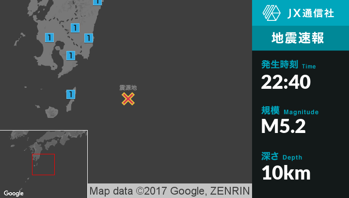 | 震度1 | 西都市, 新富町, 宮崎美郷町, 高千穂町, 宮崎市, 日南市, 串間市, 都城市, 小林市, 鹿児島市, 霧島市, 鹿屋市, 志布志市, 大崎町, 錦江町, 肝付町, 三島村 |